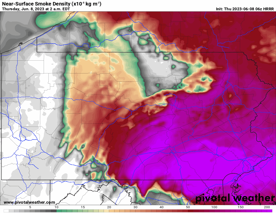 The worst air quality this week is present this morning in much of South Central & Southeast PA (AQI 300-500). Fortunately, the plume of thick smoke causing this will drift south today and exit the area by the afternoon. We won't see an immediate sizable improvement in air quality though, more so a gradual change. More smaller plumes of smoke are likely this afternoon into tonight.