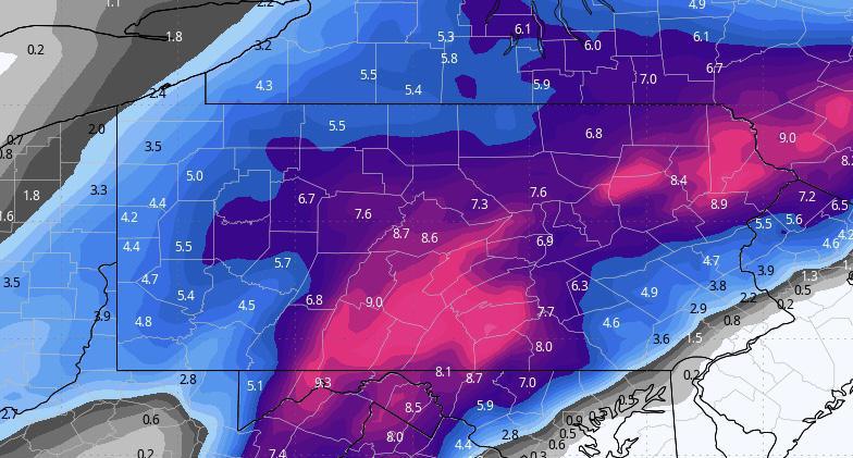 Over the last 24 hours since our last update, models have had some shifts as expected. Most notably, the axis of heaviest snowfall accumulation has shifted northwest. Also, there has been a uniform trend towards a somewhat weaker system with a lower maximum snowfall potential. This time on Monday, it appeared maximum accumulations may be 10-15”, however now that’s been reduced to 6-10”. Nonetheless, still a significant storm. We remain 100 hours out, so plenty of time for further trends which may not be good news for those looking for a heavy snowfall in Southeast PA. Starting with the European model, which has most significantly reduced accumulations the last few runs due to weaker precipitation rates, albeit still projecting a long period of moderate snow. Places near the MD line and I-95 mix with rain on the latest run. Note that for timing on these models, 00z is 7pm the previous day, 06z is 1am, 12z is 7am, and 18z is 1pm. Highest accumulations are across South Central PA up to the Poconos, on the order of 6-10”.